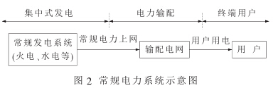 常規(guī)電力系統(tǒng)可簡化為如圖2所示,系統(tǒng)包括集中式發(fā)電、電力輸配、終端用戶3個環(huán)節(jié),系統(tǒng)運轉(zhuǎn)模式是“即用即發(fā)”,即發(fā)電端根據(jù)用戶端負(fù)荷的變化來調(diào)節(jié)發(fā)電量,此種運轉(zhuǎn)模式面臨著非常苛刻的變負(fù)荷要求。