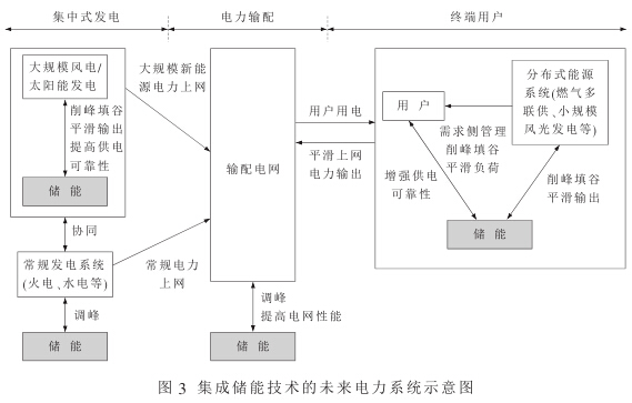 未來的電力系統(tǒng)要包含可再生新能源電力,而新能源電力的大比例接入則會出現(xiàn)前面提到的潛在問題。如圖3所示,在電力系統(tǒng)中采用集成儲能模塊是解決電力系統(tǒng)變負(fù)荷和新能源電力接入產(chǎn)生問題的有效措施。