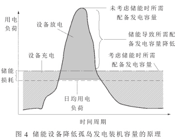在電力系統(tǒng)中引入儲能模塊,在不同時間點進(jìn)行電能吞吐,相當(dāng)于在電力系統(tǒng)中添加了一個可調(diào)節(jié)維度,最終實現(xiàn)整個系統(tǒng)的高效、低成本和可靠運行。此外,電力儲能在離網(wǎng)孤島終端的使用也是其重要的應(yīng)用場合,通過設(shè)置適當(dāng)規(guī)模的電力儲能裝置,在用電低谷時充電、用電高峰時放電,會降低離網(wǎng)孤島終端所需匹配的發(fā)電能力/容量,同時使發(fā)電機(jī)組維持運行在穩(wěn)定工況,提高整個系統(tǒng)的能量效率和經(jīng)濟(jì)性能,圖4說明了其原理。