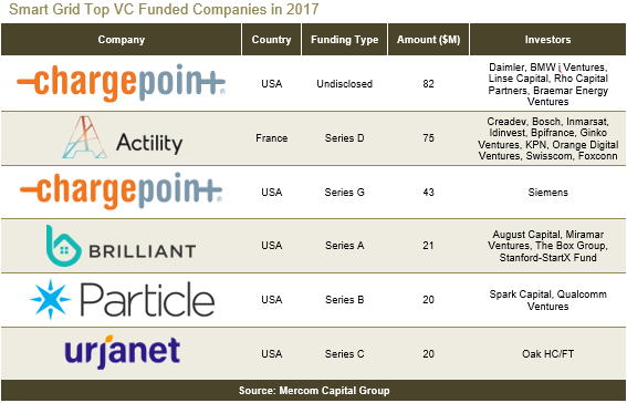 2017年,智能電網(wǎng)領(lǐng)域獲得風(fēng)投資金共計(jì)4.22億美元,涉及交易45個,去年為3.89億美元,涉及交易42個。