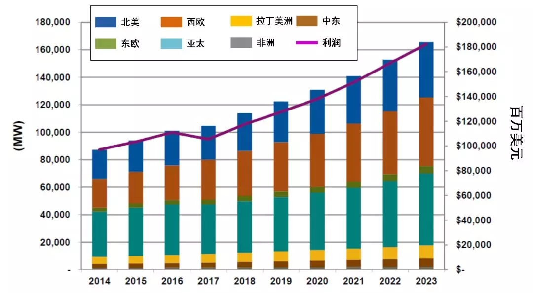 根據(jù)Navigant Research的研究,全球分布式電源容量2023年將達(dá)到16550萬(wàn)千瓦。其中,北美、西歐和亞太地區(qū)將是領(lǐng)頭軍,尤其是亞太地區(qū),占比達(dá)到32%(5230萬(wàn)千瓦)。