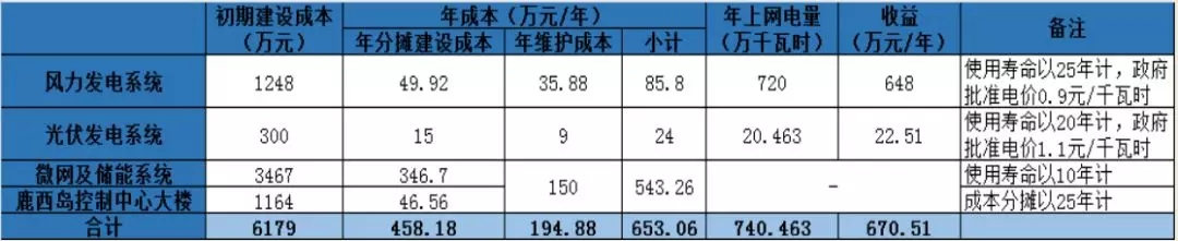 風(fēng)力發(fā)電系統(tǒng)由華儀公司投資,約1248萬(wàn)元;光伏發(fā)電系統(tǒng)由正泰公司投資,約300萬(wàn)元。因此,鹿西微網(wǎng)初期建設(shè)總體投資金額6179萬(wàn)元。