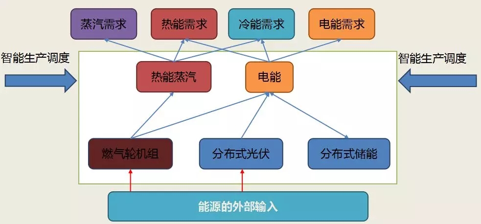 上圖是高郵市項(xiàng)目的系統(tǒng)功能關(guān)系圖。能源的外部輸入是天然氣,主要是提供熱能蒸汽和電能;通過(guò)分布式光伏主要為園區(qū)提供了電能,儲(chǔ)能是分布式能源的配套設(shè)備。