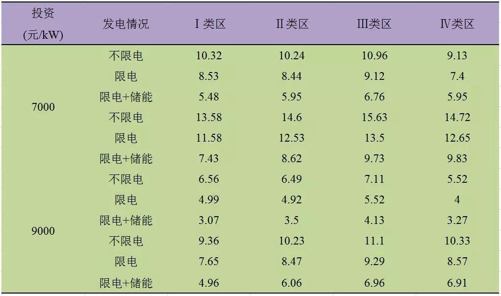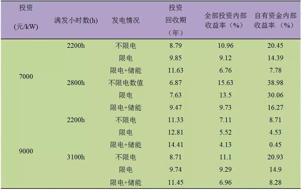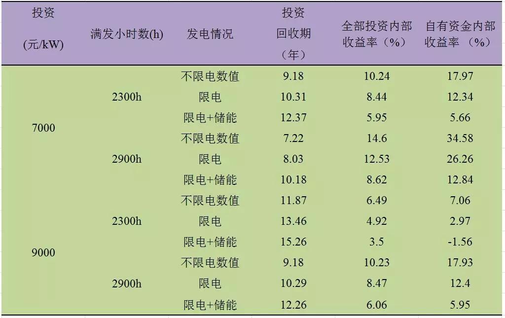 Ⅱ類電價區(qū)的滿發(fā)小時數在2300h-2900h之間。通過測算,經濟性指標匯總結果匯總如表4所示: