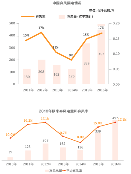 棄風(fēng)限電是我國風(fēng)電行業(yè)難以克服的一塊沉疴舊疾,也是一直困擾我國風(fēng)電發(fā)展的核心問題。2015年,我國棄風(fēng)限電問題反彈,并有進(jìn)一步惡化之勢。數(shù)據(jù)顯示,2016年全年風(fēng)電棄風(fēng)電量497億千瓦時(shí),同比增加158億千瓦時(shí);平均棄風(fēng)率17%,同比上升2個(gè)百分點(diǎn)。按平均電價(jià)0.5元/千瓦時(shí)計(jì)算,2016年損失電量收益近250億元。