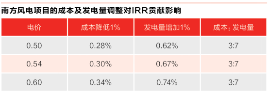 針對北方風(fēng)電場和南方風(fēng)電場的不同特點(diǎn),曹志剛給出了具體的破局路徑:北方項(xiàng)目應(yīng)以降本為主,“通過擴(kuò)大項(xiàng)目規(guī)模,共用升壓站、接入送出系統(tǒng)、場內(nèi)道路等來拉低項(xiàng)目初始投資?!蹦戏巾?xiàng)目應(yīng)以提高發(fā)電量為主,“在目前電價(jià)情況下,成本降低1%對IRR影響約0.25%~0.34%,發(fā)電量增加1%對IRR影響約0.58%~0.74%,成本與發(fā)電量對IRR的貢獻(xiàn)影響比約為3:7?!?