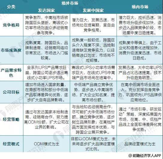 而大部分發(fā)展中國(guó)家的市場(chǎng)成熟度較低,小功率UPS市場(chǎng)需求巨大,在線式UPS中高端產(chǎn)品市場(chǎng)尚處于培育期,跨國(guó)UPS巨頭對(duì)當(dāng)?shù)厥袌?chǎng)介入程度不深,本土制造廠商缺乏競(jìng)爭(zhēng)實(shí)力,因此,市場(chǎng)競(jìng)爭(zhēng)以經(jīng)銷商進(jìn)口產(chǎn)品為主,市場(chǎng)呈自由競(jìng)爭(zhēng)格局。鑒于發(fā)展中國(guó)家市場(chǎng)潛力巨大,發(fā)展迅速,且市場(chǎng)進(jìn)入門檻不高,公司采取與當(dāng)?shù)刂?jīng)銷商合作的策略,盡可能擴(kuò)大中低端市場(chǎng)份額,確立差異化競(jìng)爭(zhēng)優(yōu)勢(shì),逐步樹(shù)立自有品牌形象,并在中高檔產(chǎn)品方面發(fā)揮比較成本優(yōu)勢(shì),積極與跨國(guó)企業(yè)展開(kāi)競(jìng)爭(zhēng)。