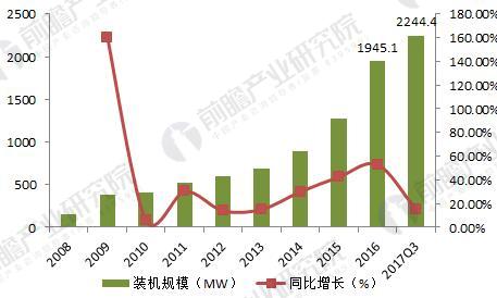 圖表2:2008-2017年全球電化學(xué)儲(chǔ)能項(xiàng)目累計(jì)裝機(jī)規(guī)模(單位:MW,%)