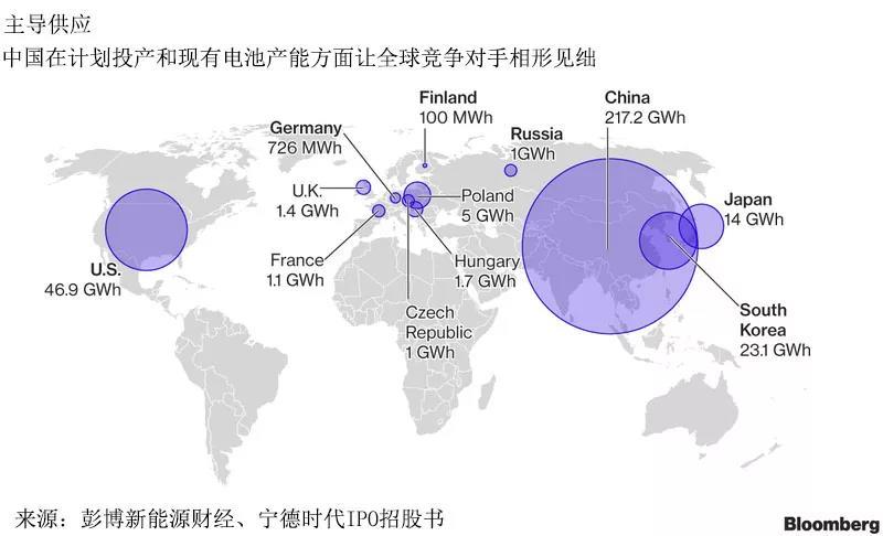 即將進行的首次公開募股將推動寧德時代成為全球最大的鋰離子電池制造商。該公司此前預(yù)計,到2020年銷售額將達到1000億元人民幣,相比2016財年149億元的全年營收有大幅提升。彭博新能源財經(jīng)(BNEF)的數(shù)據(jù)顯示,到2021年,中國占全球電池產(chǎn)量的市場份額將從2017年的54%上升到70%左右。