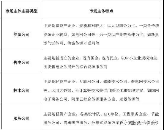 新時代下的能源綜合服務(wù)具有傳統(tǒng)能源生產(chǎn)消費的技術(shù)和運營屬性,融合了新的商業(yè)模式和業(yè)態(tài),將更具有戰(zhàn)略和商業(yè)屬性。按照綜合能源服務(wù)的主要市場參與主體,這里大致歸納為能源公司、售電公司、服務(wù)公司和技術(shù)公司四類,具體見表4。