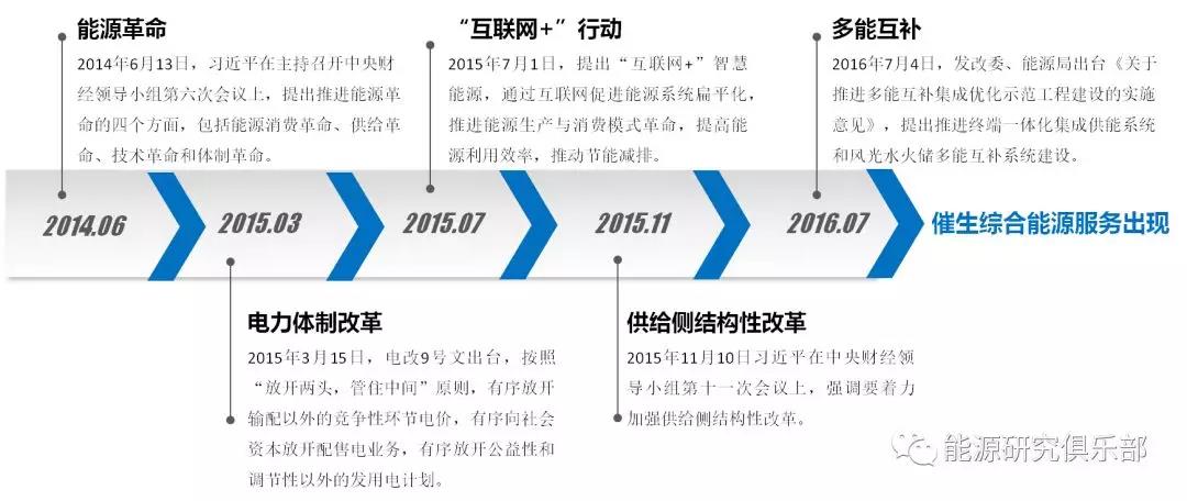 2014年6月13日,習(xí)近平總書記親自主持召開中央財經(jīng)領(lǐng)導(dǎo)小組第6次會議,明確提出了我國能源安全發(fā)展的“四個革命”戰(zhàn)略思想,即:推動能源消費革命,抑制不合理能源消費;推動能源供給革命,建立多元供應(yīng)體系;推動能源技術(shù)革命,帶動產(chǎn)業(yè)升級;推動能源體制革命,打通能源發(fā)展快車道。隨后電力體制改革9號文出臺,按照“管住中間,放開兩頭”的原則,提出“三放開、一獨立”政策,而供給側(cè)結(jié)構(gòu)性改革著力在去產(chǎn)能方面發(fā)力,特別是煤炭去產(chǎn)能成為能源領(lǐng)域的重要內(nèi)容,并以“互聯(lián)網(wǎng)+”智慧能源這一新概念促進能源系統(tǒng)扁平化,加上多能互補的發(fā)展方向,這一系列政策的出臺(具體見圖1)有效地推動了能源供應(yīng)結(jié)構(gòu)向多元化發(fā)展,從而促進新業(yè)態(tài)的發(fā)展,催生新的商業(yè)模式,即綜合能源服務(wù)的誕生。