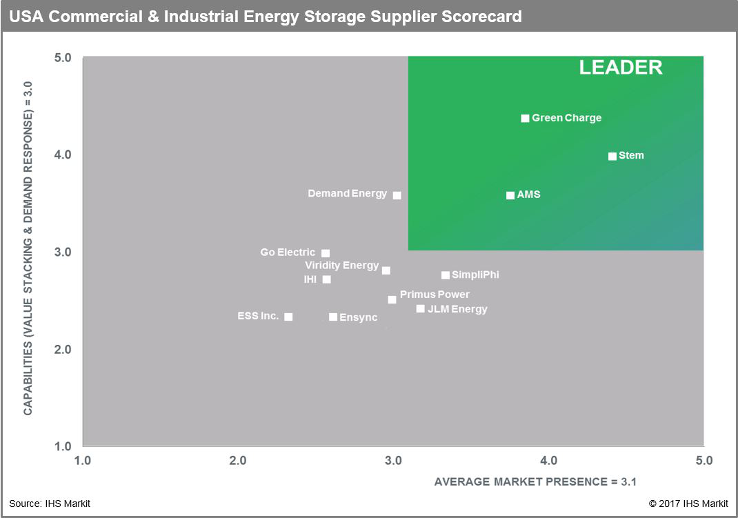 根據(jù)IHS Markit,Stem被評(píng)為最高效的工/商業(yè)儲(chǔ)能系統(tǒng),Green Charge 和AMS分別排在第二和第三,躋身前十二的公司名單還有Demand Energy、Go Electric、Viridity Energy、IHI、SimpliPhi、Primus Power、JLM Energy、ESS、Lockheed Martin和Ensync。