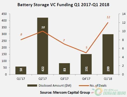 Mercom Capital今天發(fā)布了其關(guān)于電池、智能電網(wǎng)和能效融資的季度報(bào)告。該報(bào)告發(fā)現(xiàn),在2018年第一季度,電池公司的風(fēng)險(xiǎn)資本投資同比增長(zhǎng)5倍,達(dá)到2.99億美元。這2.99億美元是儲(chǔ)能電池公司12輪的風(fēng)險(xiǎn)融資資金。其中最主要的是電池集成商Stem,它在D輪融資從Activate Capital獲得了8000萬(wàn)美元的啟動(dòng)資金。