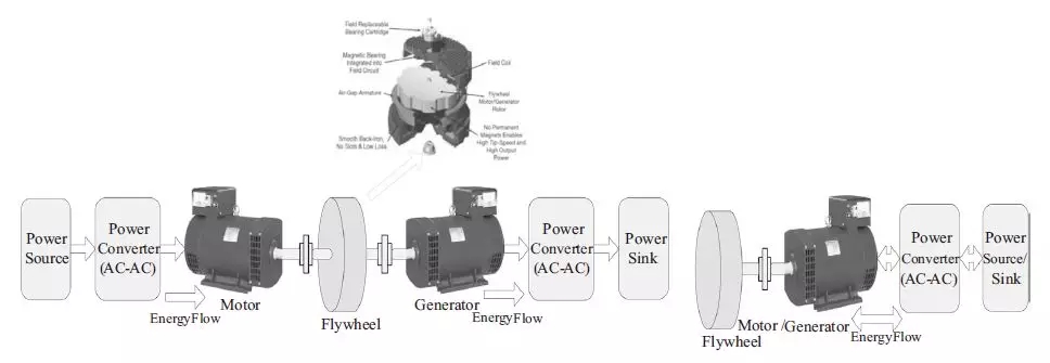 由于電力電子和材料工程的進(jìn)步,飛輪儲(chǔ)能系統(tǒng)(FES)適用于電動(dòng)汽車和動(dòng)力系統(tǒng)[36]。能量效率在90-95%和功率規(guī)模0-50 MW [36 - 43] 。飛輪系統(tǒng)包括在腔室中旋轉(zhuǎn)的圓柱形本體,聯(lián)接軸承,以及能量傳遞裝置,發(fā)電機(jī)/電動(dòng)機(jī)一起安裝在一個(gè)共同的軸上[15,30,36,37] 。保持飛輪不斷旋轉(zhuǎn)的能量被轉(zhuǎn)換成推動(dòng)傳動(dòng)裝置的電能。