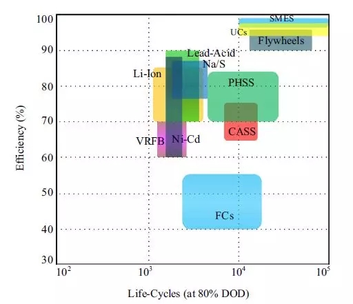 循環(huán)壽命是指ESS的耐久性,取決于ESS可以充電后提供能量的次數(shù)。循環(huán)壽命取決于構(gòu)成ESS的材料和操作水平。效率指的是ESS從所存儲(chǔ)的能量中輸送的能量的量。ESS可能受到幾個(gè)參數(shù)的限制,如自放電,循環(huán)壽命,材料特性,能量轉(zhuǎn)換和工作溫度。ESS的規(guī)模是EV應(yīng)用ESS的關(guān)鍵特征。緊湊的尺寸對(duì)應(yīng)于電池效率性能。高能量密度對(duì)應(yīng)于小的質(zhì)量和體積。成本與規(guī)模密切相關(guān)。而且,ESS的資本成本包括存儲(chǔ)系統(tǒng)的設(shè)計(jì),材料,包裝,維護(hù),損耗,壽命,因環(huán)境問題的經(jīng)營成本的一部分[4- 8,46] 。