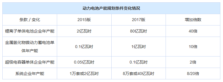 2016年11月,在2015版《汽車動(dòng)力蓄電池行業(yè)規(guī)范條件》基礎(chǔ)上,工信部組織形成了《汽車動(dòng)力電池行業(yè)規(guī)范條件(2017年)》(征求意見稿),并公開向全社會(huì)征求意見。這也就是所謂的“2.0版”白名單。該版本的最大變化在于,產(chǎn)能要求相比2015年的“1.0”版提高了40倍。