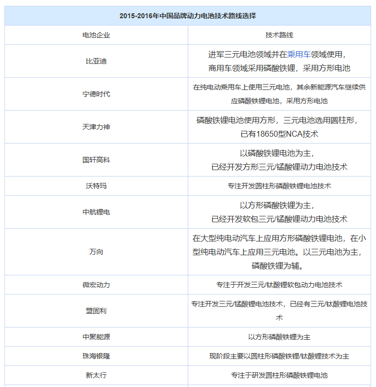 2015-2016年中國品牌動(dòng)力電池技術(shù)路線選擇