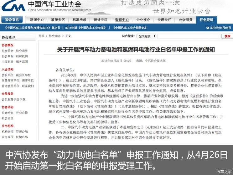 2018年4月27日,中汽協(xié)官方網(wǎng)站發(fā)布了《關(guān)于開展汽車動(dòng)力蓄電池和氫燃料電池行業(yè)白名單申報(bào)工作的通知》,通知指出:將由中國汽車動(dòng)力電池產(chǎn)業(yè)創(chuàng)新聯(lián)盟組織實(shí)施《汽車動(dòng)力蓄電池和氫燃料電池行業(yè)白名單暫行管理辦法》,并接受工信部等有關(guān)部門的指導(dǎo)、監(jiān)督。