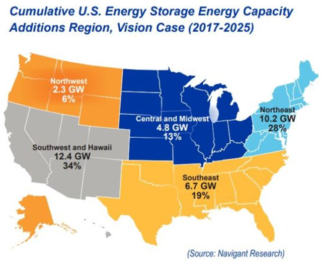 如今,人們看到加利福尼亞州、紐約州、馬薩諸塞州、新澤西州政策變化將會促進(jìn)儲能發(fā)展。因此,機(jī)會無處不在。每個市場都有獨特的驅(qū)動因素,儲能將以不同的方式適應(yīng)不同的市場。在太平洋西北地區(qū),水力發(fā)電擁有大量蓄能,其儲能的使用方式與德克薩斯州風(fēng)力發(fā)電和需要管理高度間歇性太陽能發(fā)電資源的州有所不同。