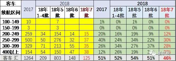 18年第7批的客車的續(xù)航里程有所提升,續(xù)航里程主要是靠300公里的車型推出增多的促進(jìn)。