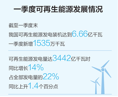 同時,可再生能源利用水平顯著提升。一季度可再生能源發(fā)電量達(dá)3442億千瓦時,同比增長14%;可再生能源發(fā)電量占全部發(fā)電量的22%,同比上升1.4個百分點(diǎn)?!叭龡墶眴栴}有效緩解:全國基本無棄水;棄風(fēng)電量91億千瓦時,棄風(fēng)率8.5%,同比下降8個百分點(diǎn);棄光電量16.2億千瓦時,棄光率4.3%,同比下降5.4個百分點(diǎn)。