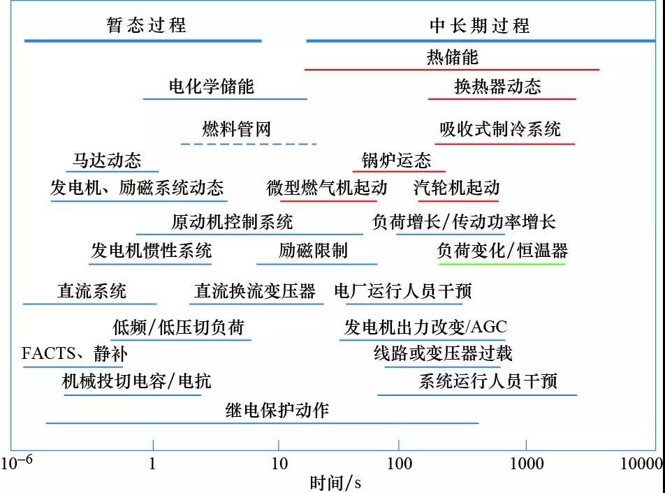 1)按照多能設(shè)備的動態(tài)響應(yīng)時間劃分動態(tài)過程的各個階段,綜合能源系統(tǒng)中的部分環(huán)節(jié)動態(tài)響應(yīng)時間常數(shù)如圖2所示??梢妱討B(tài)響應(yīng)時間變化范圍非常大,從幾微秒到幾天時間。