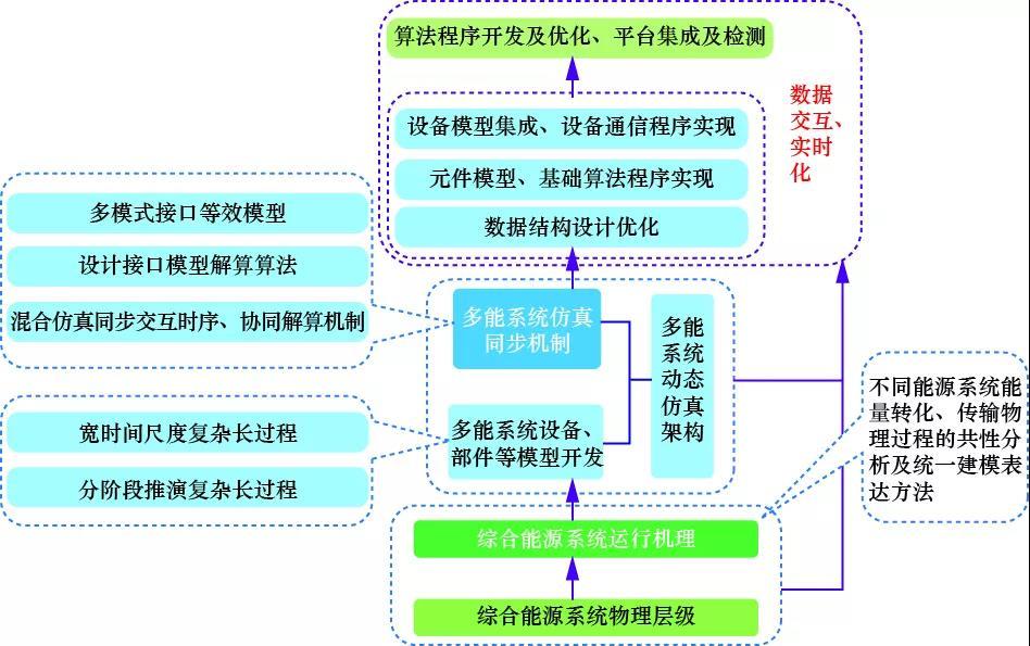 出于系統(tǒng)安全運(yùn)行考慮,不能通過施加各種擾動試驗來了解其動態(tài)特性,于是增加對系統(tǒng)動態(tài)特性的了解最有效的方法就是通過動態(tài)仿真。縱觀目前電網(wǎng)、微電網(wǎng)、熱電廠、熱力系統(tǒng)等能源系統(tǒng)的既有仿真技術(shù)手段,其并不能滿足綜合能源系統(tǒng)動態(tài)、暫態(tài)仿真的需求。因此,開展綜合能源系統(tǒng)混合仿真關(guān)鍵技術(shù)及平臺建設(shè)研究,將對綜合能源系統(tǒng)的規(guī)劃建設(shè)、穩(wěn)定經(jīng)濟(jì)優(yōu)化運(yùn)行與動態(tài)調(diào)控、新型設(shè)備研發(fā)和測試,起到強(qiáng)有力的支撐作用。