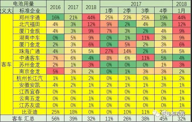 客車市場中的鄭州宇通很強,保持44%左右的領先電池用量比例,比17年份額暴增1倍。12月北汽福田的電池裝機達到12%。