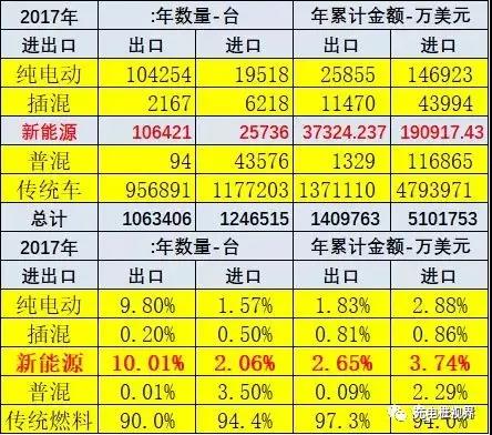 2017年新能源汽車進出口總體表現(xiàn)較好其中2017年從新能源車出口量達到10.6萬臺,進口達到25736臺,普通混動車的進口也表現(xiàn)較強,來到了43576臺,從進出口的占比來看,機動車的出口,占比達到10.01%,新能源車進口,占比達到了2.6%。