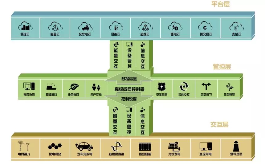 上圖為“王”字微網(wǎng)技術(shù)體系,由下而上分別為:交互層、管控層、平臺層,可以從這三個角度去思考能量管理系統(tǒng)。