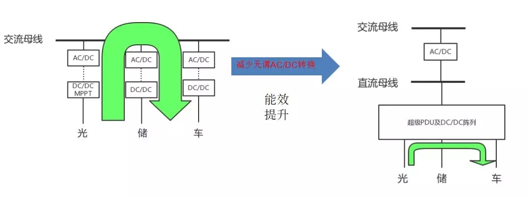 以光伏系統(tǒng)為例,光伏出來的都是直流電,通過DC/DC的電壓變換,然后做DC/AC掛到交流母線上。儲能也是通過直流變交流掛到網(wǎng)上。將光伏發(fā)電傳送到車上的時候,不但要把直流變成交流,還要再把交流變成直流,這樣能量就會有無謂的損失。上圖中右側(cè)是直流微網(wǎng)的架構(gòu),把光伏、儲能和汽車都直接并在直流側(cè),用一個超級PDU做能量的分配,實(shí)現(xiàn)在直流端能量的直接的相互的流動。
