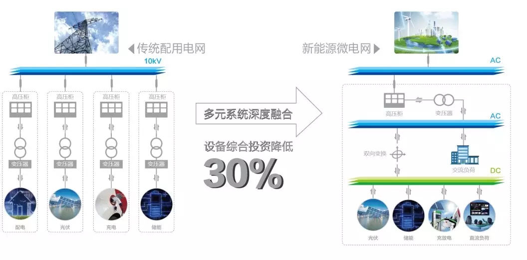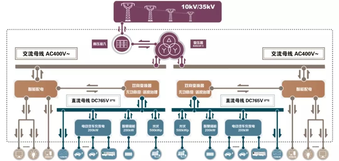 我們把配電、光伏、儲能、充電等電力電子設(shè)備高度集成,做到一個箱變里面,外面接10kv,配交流和直流兩條母線,交流的負(fù)載做到交流母線上,直流的負(fù)載做在直流母線上,這樣一個箱變就解決了四個箱變的問題,用一個箱變的投資代替四個箱變的投資,設(shè)備的綜合投資包括占地面積、集約程度都會有一個很大的進(jìn)步,就會形成一個高度集成的系統(tǒng)。