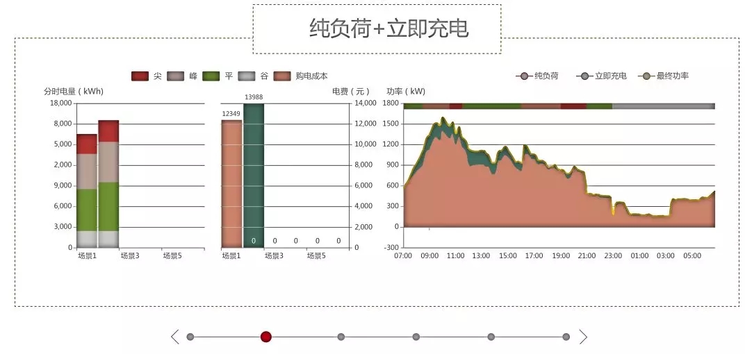 上圖是園區(qū)最初的用電情況。左邊是用電負(fù)荷,中間是電費(fèi)情況,綠色的圓柱代表的是廠區(qū)的純負(fù)荷,加上引進(jìn)電動車之后的無序充電,從右側(cè)的圖中可以看到,上午的時候峰值很高,夜晚谷電的時候基本上無人使用,這也是大部分園區(qū)目前的用電情況。