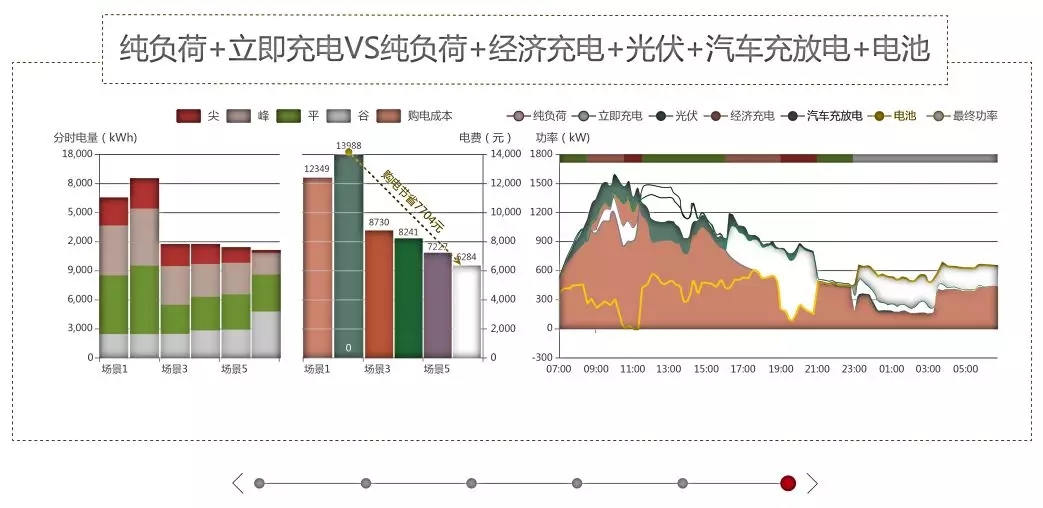 根據(jù)上述情況,我們把光伏引進(jìn)到微網(wǎng)中,園區(qū)的電費(fèi)直接降到了8730元;把車有序的充放電、儲能電池引進(jìn)之后,從右側(cè)的負(fù)荷情況中可以看到低谷時期的負(fù)荷比以前高了很多,尖峰的時候比以前低了很多,全天的負(fù)荷比較平滑,電費(fèi)也達(dá)到了50%左右的節(jié)能開支,可以說在微網(wǎng)的應(yīng)用上取得了一定的成功。