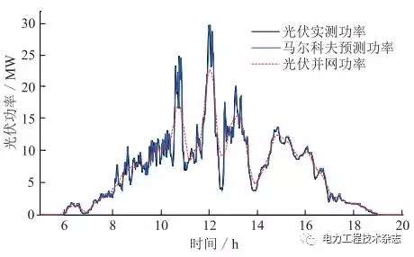 圖2 光伏實測功率和預(yù)測功率以及并網(wǎng)功率曲線