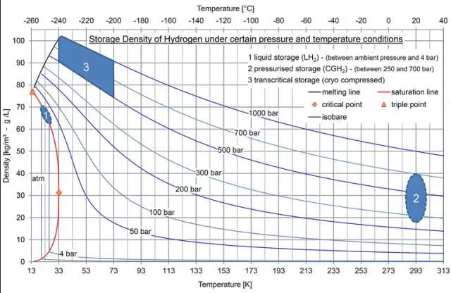 已被確認(rèn)并被使用的氫氣儲存是經(jīng)由壓縮或液化的純氫儲存;常用的氫氣儲存是壓縮氫氣。隨著壓力的增加,氫密度隨之增加。圖3表示氫氣在不同的壓力和溫度的條件下儲存的密度。