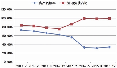 圖五 2015年12月以來(lái)堅(jiān)瑞沃能各季度資產(chǎn)負(fù)債率和流動(dòng)負(fù)債占比情況