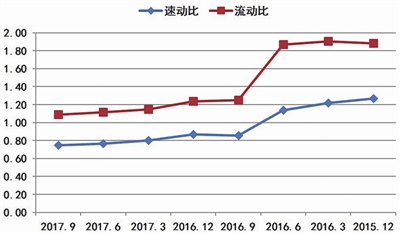 圖六 2015年12月以來(lái)堅(jiān)瑞沃能各季度流動(dòng)比、速動(dòng)比情況