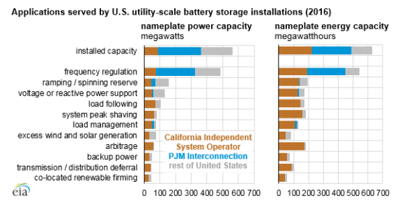 此后,PJM公司的公用事業(yè)規(guī)模電池存儲(chǔ)容量從2012年的38兆瓦增加到2016年的274兆瓦。該地區(qū)已安裝的電池容量超過90%用于頻率調(diào)節(jié),這有助于保持二次電網(wǎng)的電網(wǎng)頻率,以秒為基礎(chǔ)。PJM中的公用事業(yè)規(guī)模的電池存儲(chǔ)設(shè)備傾向于具有相對較大的功率,平均為12兆瓦,并且放電持續(xù)時(shí)間短,平均只有45分鐘。
