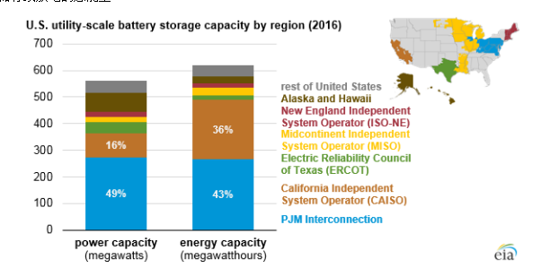 美國公用事業(yè)規(guī)模蓄電池儲(chǔ)能容量的地區(qū)分布