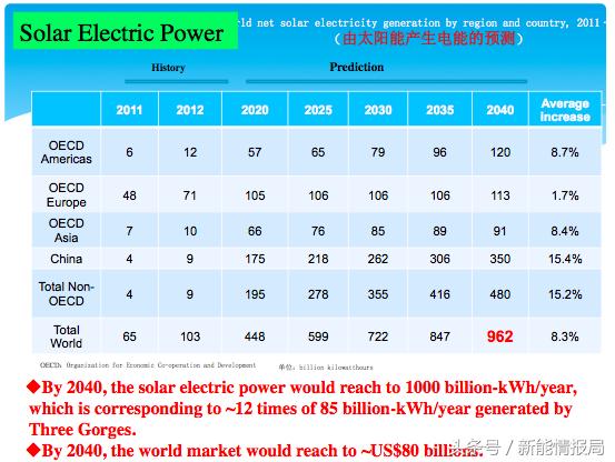 假如我們發(fā)展新能源,首先是太陽(yáng)能,我們來看太陽(yáng)能是什么樣的情況,這里列出的是在世界上不同范圍、不同區(qū)域從2011年到2040年太陽(yáng)能產(chǎn)生電能的預(yù)測(cè)。我們可以看到到2040年,地球上的太陽(yáng)能發(fā)出的電,每年有1萬(wàn)億度電,相當(dāng)于三峽電站發(fā)電量的10—12倍。