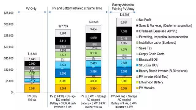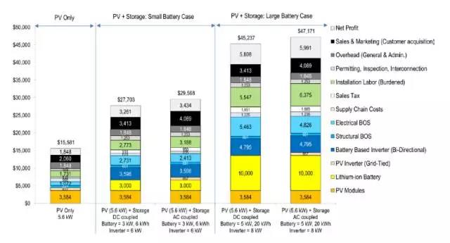 圖1:住宅太陽(yáng)能光伏+儲(chǔ)能系統(tǒng),小型電池案例的總安裝成本和價(jià)格構(gòu)成模型(2016年美元現(xiàn)價(jià))