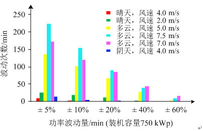 從圖2的統(tǒng)計結果看出:功率波動幅值主要集中在光伏裝機容量的±5%~±40%范圍內,超過±60%范圍的功率波動次數較少;多云天氣下,功率波動更頻繁,主要是由于云移動過程中頻繁地遮擋太陽造成;晴天和陰天下功率波動次數很少,幅值也很低,主要因為晴天云少,對太陽的遮擋較少,而陰天光伏本身出力就低,使得功率的可波動范圍相應地被縮小。