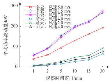 各國電力系統(tǒng)對光伏并網功率的波動性要求不完全相同,如波多黎各電力局對功率波動要求是小于±10%/min,墨西哥電力局要求將功率波動控制在±1%~±5%/min范圍內[3]。在圖2的統(tǒng)計結果基礎上,圖3繪制了在不同時間尺度(1—30 min)下功率波動的變化趨勢。整體來看,隨著時間窗口的增大,功率波動量也隨著增大。多云天氣下的功率波動明顯比晴天和陰天下波動幅度大。另外,在多云天氣下,風速越大,功率的波動量也越大,因為風速越大,云的移動速度也越大,遮擋太陽的頻率增大。此外,晴天和陰天環(huán)境下,功率波動量和風速之間的相關性較小。