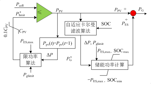 卡爾曼濾波算法在電力系統(tǒng)狀態(tài)估計、新能源發(fā)電等方面得到了廣泛應用[17],本文采用自適應卡爾曼濾波算法對光伏功率PPV進行濾波,得到光伏并網功率參考值P?GPG?,然后基于P?GPG?和儲能電池的SOC,計算得到儲能PCS的充放電功率指令PES。