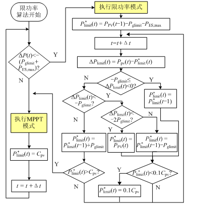 若ΔP(t)<-(Pglimit+PES,max),EMS命令光伏PCS開始執(zhí)行限功率控制,并給定P?limitPlimit?的初始值;反之,則控制光伏PCS執(zhí)行MPPT控制。