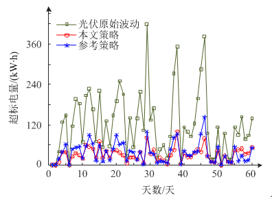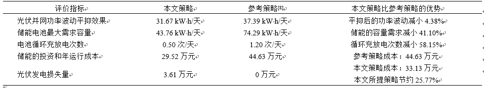 計算得出光伏原始功率超標電量、經本文策略以及經參考策略平抑后的超標電量的平均值分別為:123.27 kW?h/天、31.67 kW?h/天、37.39 kW?h/天。從超標電量的均值來看,本文所提策略和參考策略都能有效地平抑光伏功率波動,但本文策略超標電量的平均值更小,平抑效果更好。