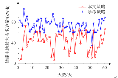 2種策略Eneed的分布情況如圖11所示,從仿真結果可以直觀地看出本文所提策略對儲能的容量需求遠小于參考策略。