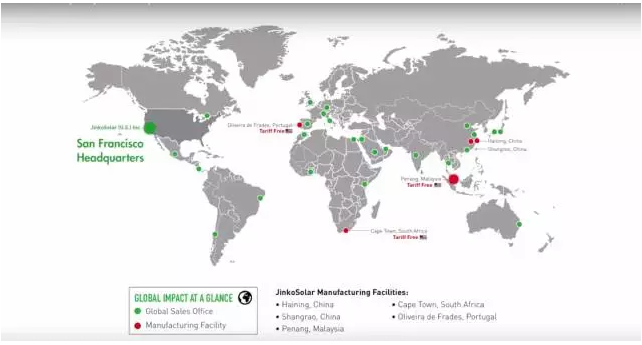 下圖是全球組件出貨量第一的晶科能源的全球布局: