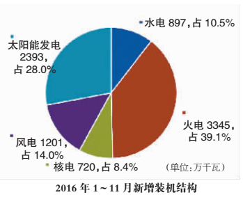 受煤電政策、環(huán)境約束等因素影響,2016年1~11月,全國新增裝機(jī)規(guī)模同比下降了5.4%,為8557萬千瓦。其中,火電新增裝機(jī)同比下降了30%,非化石能源新增裝機(jī)同比增長21%,比重進(jìn)一步提升至60.9%,創(chuàng)下歷史新高。預(yù)計全年新增裝機(jī)規(guī)模將達(dá)到1.3億千瓦,同比下降1.7%。其中,非化石能源新增裝機(jī)比重為61.1%。期末總裝機(jī)容量達(dá)到16.5億千瓦,同比增長8.5%,非化石能源裝機(jī)比重達(dá)到36.2%,較2015年提高了2.1個百分點(diǎn)。